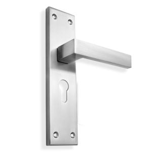 Lever Handles is a type of door handle. This type of handle consists of black plate and key cut hole. The handles are opened by pushing the handle and they can be locked by a key. The lever handles are used mostly in bathrooms as they can be easily locked and unlocked easily.