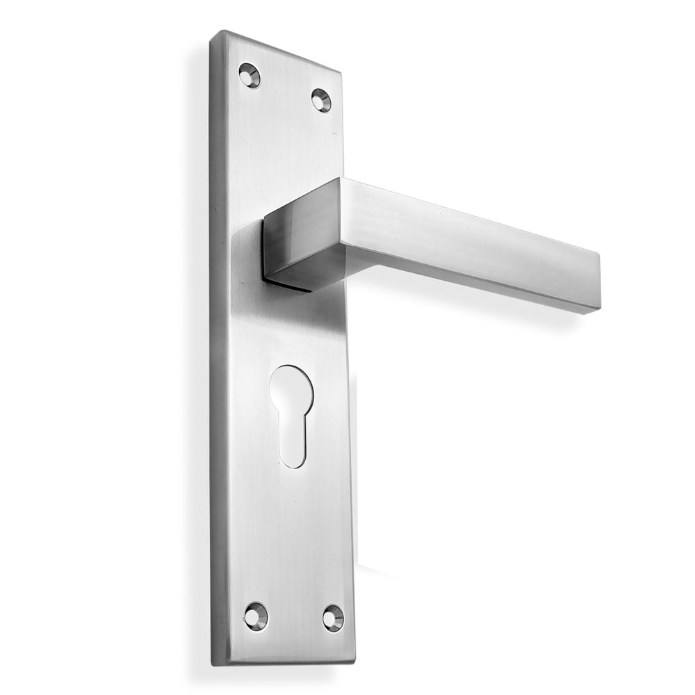 Lever Handles is a type of door handle. This type of handle consists of black plate and key cut hole. The handles are opened by pushing the handle and they can be locked by a key. The lever handles are used mostly in bathrooms as they can be easily locked and unlocked easily.